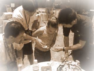 イベント2日目。 TAKちゃんたらもう、すっかり普通のトレードでは満足できない人間になってるの。 普通、レアピンが欲しいときは、「そのピンが欲しいんだけど、何個とトレードしてくれますか?」と相手に尋ねたり、「私のトレード用の中から好きなピンを選んでください。」とか言って交渉するよね。 オレは問うよ、あんたホントに初参加? およそ200個はあっただろう残りのピンを、ザルですくって相手のバケツに流し込むほどの豪快なトレードで、次々とレアピンを捕らえていくのだ! 探していたピンは、ほとんどGETできたんじゃないのかな? オレは今まで11年間コレクションしてきて、ピンを量り売りでトレードする人間は初めて見たぞ(笑)!